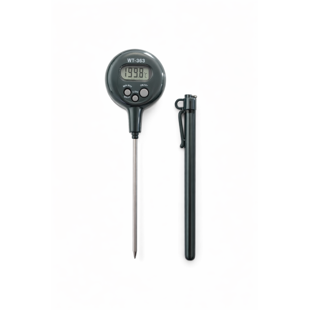 Termómetro digital WT-363 con sonda de acero inoxidable, ideal para medir temperatura en alimentos y líquidos. Ofrece alta precisión, función Max/Min, pantalla LCD y resistencia al agua en un diseño compacto y portátil.