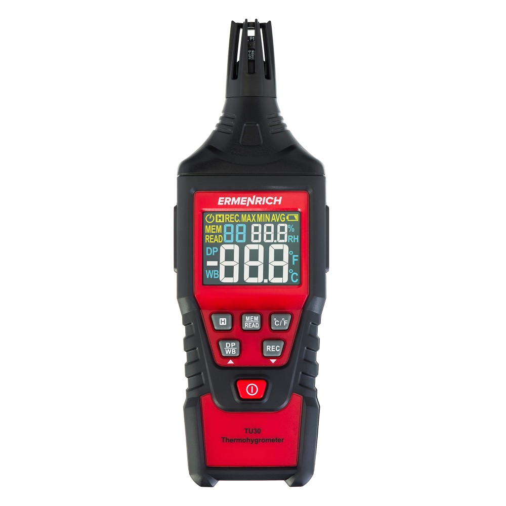 Termohigrómetro digital portátil para la medición precisa de temperatura y humedad relativa, con cálculo de punto de rocío. Incorpora pantalla retroiluminada, funciones MIN/MAX y retención de datos, siendo ideal para aplicaciones de control ambiental y mantenimiento técnico.